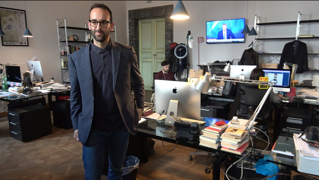 「頁報」(Il Foglio)總編輯塞拉沙(Claudio Cerasa)今天邀請中央社等駐義外媒記者參訪並舉行座談。記者按地址來到緊鄰義大利國會的一棟羅馬市區老建築,入內經過一段昏暗長廊與樓梯,映入眼簾的是低調宛如民宅的辦公室;入口沒有明顯標示,僅有牆上裱框一份放大版「頁報」,宣告著這份菁英報紙對自身的光榮感。