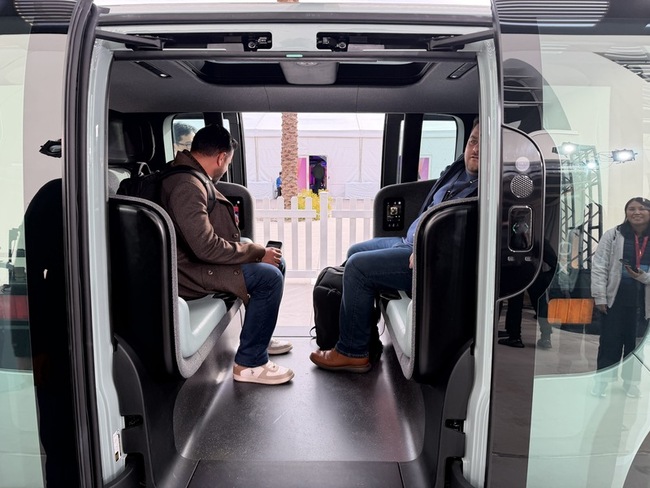 「這裡沒有方向盤,也沒有人從遠端中央控制,車輛完全依靠自己做決定」,展區現場人員指著車內寬敞的對坐空間解釋。