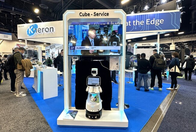 團隊來自台灣、聚焦邊緣AI晶片的耐能(Kneron)公司今年在展場攜手多家業者展示居家照護機器人、無人機等多元應用。記者走訪展位,映入眼簾的是帶著綠色乖乖的機器人站立在入口;這款主打長照市場的機器人可辨識人臉,提醒家中成員吃藥。