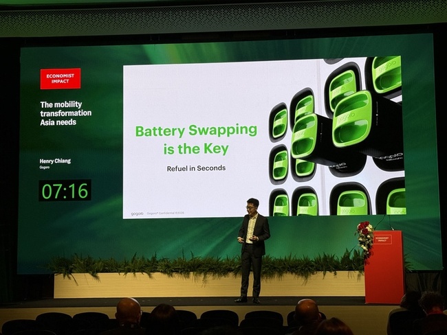 (中央社記者李宗憲曼谷26日專電)台灣能源轉型經驗登上國際舞台,電動機車品牌睿能創意(Gogoro)執行長姜家煒今天受邀出席「經濟學人」在曼谷舉行的「亞洲永續週」論壇,發表專題演說分享台灣推動電池交換替代充電的經驗。