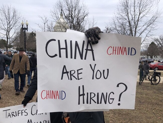 P姓員工與一群同事拿著標語寫著:「CHINAID,你有在徵人嗎?」諷刺美國國際開發總署關門後,結果只會讓中國叫好。