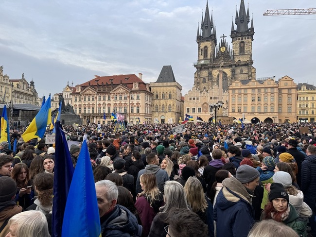 俄烏戰爭將於24日滿3年,數千人集結在捷克布拉格舊城廣場,參與「與烏克蘭同行」集會。現場參與者攜帶烏克蘭國旗與歐盟旗幟,有些人持向日葵或藍黃氣球,還有人舉標語譴責俄羅斯總統蒲亭(Vladimir Putin)暴行。
