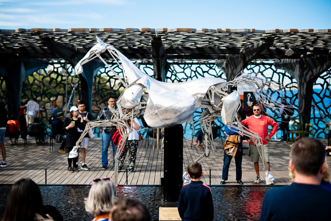 「宙斯」目前於馬賽MUCEM博物館露天頂樓免費展出,展期自4月16日至27日,吸引觀眾近距離圍觀。館方在首日邀請「半人馬劇場」(Théâtre du Centaure)現場演出,以真馬迎接機械馬「宙斯」。