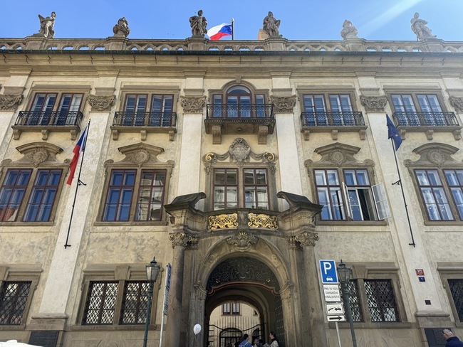 如今來到捷克文化部大門口,可見建築外觀仍保有對稱立面、雕刻壁龕與貴族徽章,體現當時貴族的權威與審美。內部則是融合巴洛克、洛可可藝術、古典主義風格,並保有哥德式、文藝復興元素,宛如歐洲建築史的一部活教材。