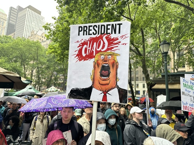 遊行隊伍在陰雨中出發,警方封鎖42街與23街間的第5大道,示威民眾有序地在隊伍中高舉標語、呼喊口號,表達對川普政府近期在洛杉磯等地拘捕無證移民、濫用總統權力的不滿。