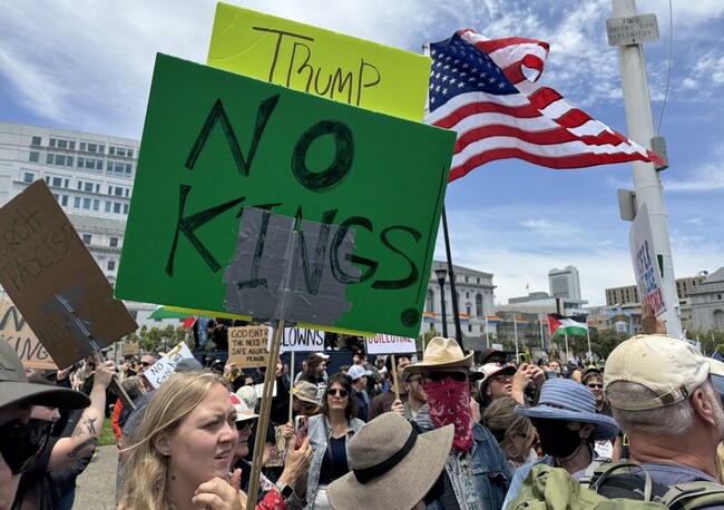 (中央社記者張欣瑜舊金山14日專電)加州今天響應「無王日」(No Kings Day)抗議。在舊金山,數萬名民眾遊行至市民廣場,警察低調部署四周、避免劍拔弩張對立氣氛。示威者凱迪說,民主法治對其他國家同等重要,不能讓世界倒退回威權主義。