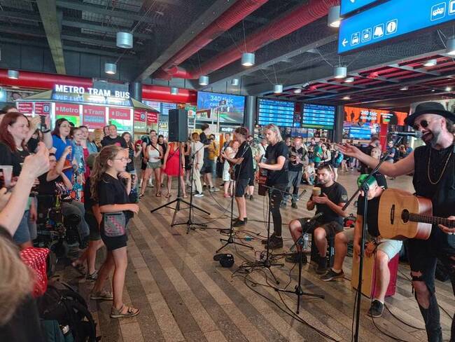 等待期間,一支搖滾樂團在大廳演奏,吸引不少滯留旅客駐足圍觀,隨音樂搖擺合唱。現場氣氛輕鬆愉快,未見混亂與抱怨,交通危機意外變成一場即興音樂派對。(編輯:陳承功)1140705