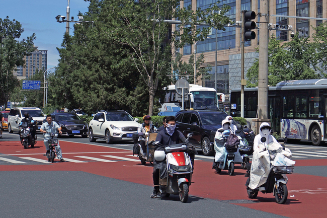 記者觀察,北京市今天中午室外溫度達到攝氏36度,炎炎夏日,騎乘電動自行車的民眾大多穿戴太陽眼鏡及沒有防護功能的遮陽帽,僅有少數外送員配戴安全帽。