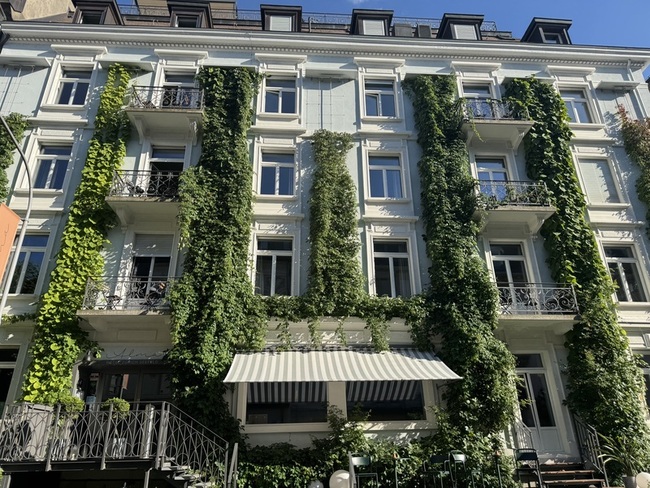 建築物本身降溫,則從外部植栽著手,將攀緣植物植於外牆,可遮光散熱。攀緣植物的生長力旺盛,向上或向下大面積生長,容易見效。另外,同時栽種多樣植物也能提供昆蟲與鳥類棲息,更活化都市生態。蘇黎世市政府正積極向一般公司與私人房屋推廣牆面綠化,並提供免費諮詢服務。市民共同參與,效果更為快速。