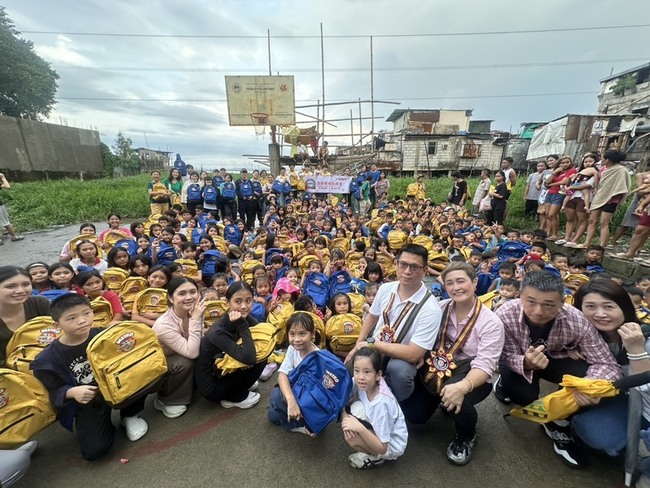 旅菲南線台商會會長游惠堯12日偕同會員,與大都會國際兒童事工(Metro World Child)志工,一行近40人在馬尼拉市以南大約30公里的水上貧窮社區,為當地孩童贈送300個新書包及學用品。