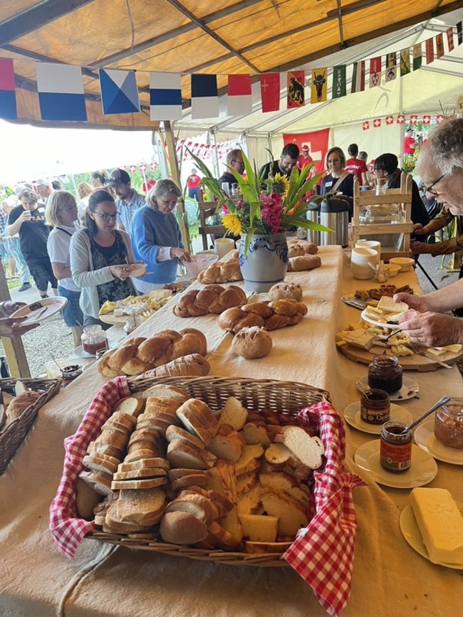 (中央社記者郭芳君蘇黎世1日專電)8月1日是瑞士國慶日,一項受歡迎的慶祝活動就是農家國慶早餐,通常主辦的農場會以自家農產品擺出豐富的自助式早午餐,有麵包、培根、臘腸、煎馬鈴薯餅、起司拼盤等瑞士美食,現場也有傳統音樂和國旗秀表演,人們在當地飲食與文化饗宴中感受國慶氣氛。