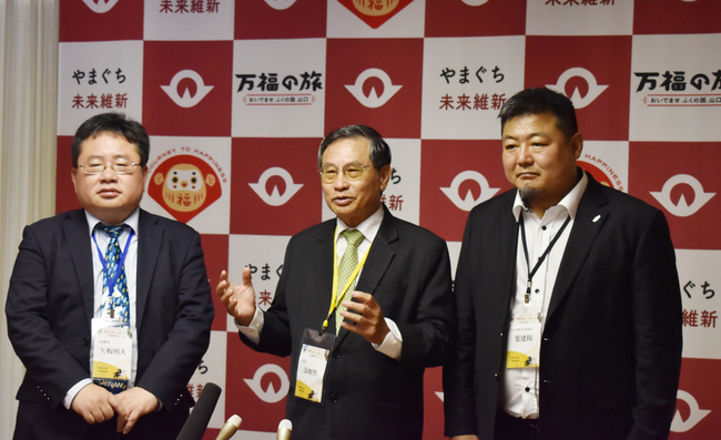 日本山口縣廳今天舉行白米捐贈儀式,日本媒體包括每日新聞、山口新聞、中國新聞,以及TYS、KRY和YAB等全國或地方性媒體都來採訪報導。