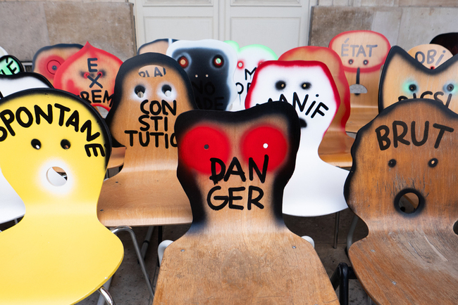 瑞納爾補充,這577張椅子代表著577位正在發聲的公民。每個關鍵字都是經過團隊反覆討論後精選出的強烈詞彙,如自發性的(spontané)、危險(danger)、素人(brut)、極端的(extrême)、憲法(constitution)、抗議(manif)、國家(état)、服從(obi)等,均象徵公民對自由、民主與制度的深刻提問。