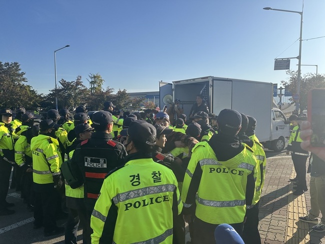 臨近金海機場的大路沿街除了設置鐵柵欄,在早上7時左右就已經部署了機動隊等警力,人數隨著時間流逝不斷增加,維安逐漸升級。