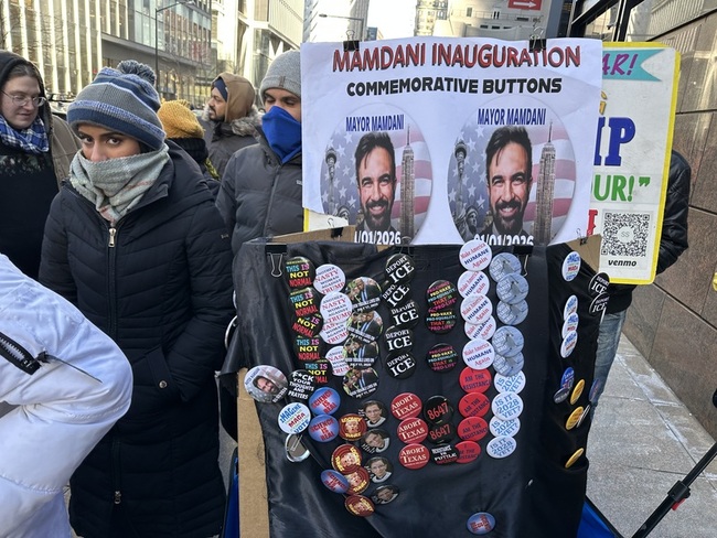 曼達尼與妻子杜瓦吉(Rama Duwaji)接受大批支持者的歡呼,在聯邦參議員桑德斯(Bernie Sanders)監誓下,曼達尼手按杜瓦吉手上的可蘭經宣誓。