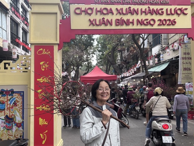 有民眾貨比三家仔細挑選花卉盆栽,有人高舉剛購入的桃花枝幹緩慢地穿越人群,也有人藉著百花齊放之時,身穿傳統服飾奧黛拍攝美照。當然,還有不少外國遊客到此,感受繁忙的春節氣息。