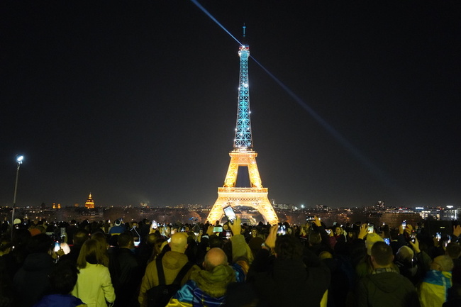 晚間近9時,人群聚集在艾菲爾鐵塔對面的托卡德洛(Trocadéro)人權廣場,在烏克蘭女子合唱團的歌聲中,等待鐵塔燈光從平時的橙黃色換成烏克蘭國旗的顏色。