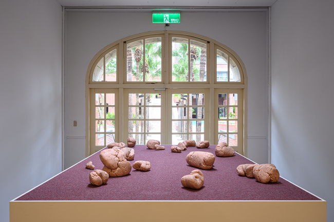 展覽入口設置陳松志的「奢侈的墮落」,他以常見地毯為底,在上頭堆放一座座帶有污漬的粉紅色口香糖,隨空間溫度還會飄散出淡淡的人工香精味。一反因咀嚼而存在的目的,陳松志改以「踩踏」完成口香糖的任務,他說,希望透過更為趣味而帶遊戲體驗的方式,重新思考身體感官。