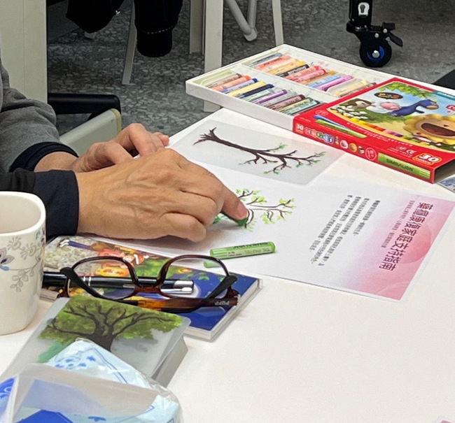 在繪畫活動中,梅姐畫下一棵光禿的樹,她形容這就像是她與孩子之間的關係。不過在其他藥癮者家屬、與曾走過這段歷程的學長姊的陪伴下,她開始思考要怎麼與孩子切割,學習照顧自己,如今這棵禿樹是「正在發新芽的樹」。