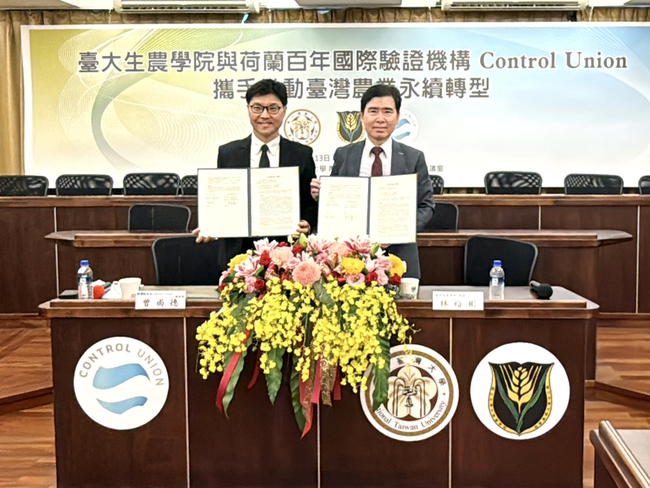 台灣大學生農學院院長林裕彬、荷蘭彼德森驗證有限公司總經理曾尚德今天簽署合作備忘錄,雙方將共同提升台灣農業品質、接軌國際市場,並發展永續農業、智慧農業、再生農業、循環經濟等先進技術,引領台灣農業走向淨零轉型。