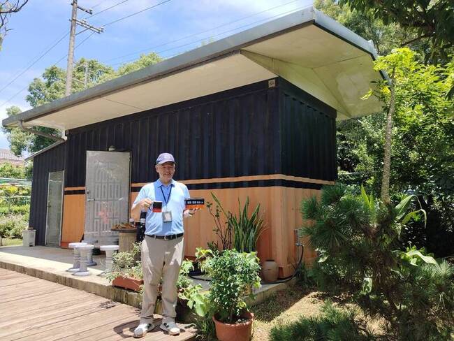 新竹縣新豐鄉1處鄉道旁的小庭園,有1輛「鳴日號」造型車廂引人注目,有不少路人經過時會停留拍照打卡,也有人好奇想仿效。這是宋鴻康退休後,在家鄉土地上打造的工具間,主要存放他在附近農田工作時需要使用的農具。