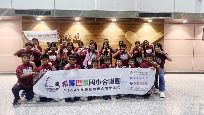 來自信義鄉山區部落的希娜巴嵐國小合唱團去年獲新加坡國際合唱節銀獎,今天再出發參加東京國際合唱大賽(Tokyo International Choir Competition)。團員登機前在桃園國際機場大廳「快閃」演出,悠揚樂聲吸引往來國際旅客欣賞,紛紛拿出手機錄影。