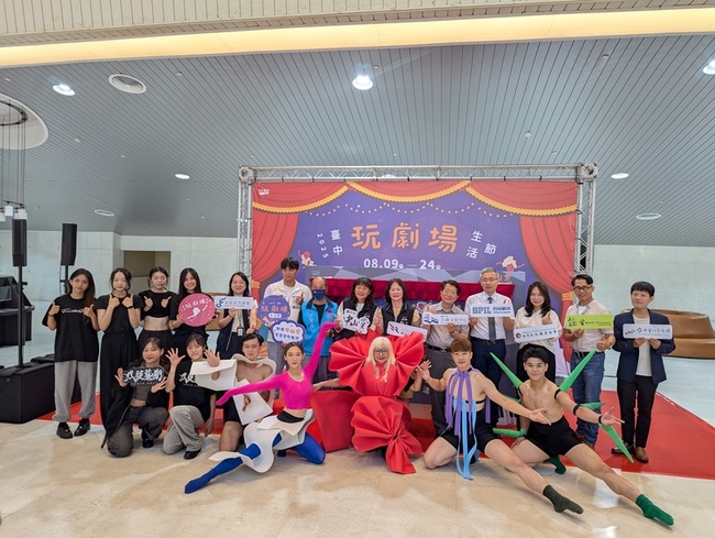 台中市府文化局與日月光文教基金會、矽品精密工業公司等單位合作舉辦「2025台中玩劇場生活節」,今天舉行宣傳活動,台中市府文化局主任秘書蕭靜萍、台中大墩文化中心主任陳文進、矽品公司處長黃忠傑、極至體能藝術團長石吉智、凡徒表演藝術總監陳翔崧等人皆出席。