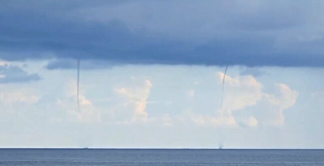 昨天下午4時許,蘭嶼外海出現2條巨大的水龍捲,當地民眾今天告訴中央社記者,當時原本看起來天氣還好,但是海上有積雲,鏡頭再拉近,就發現海上和積雲間,赫然出現了雙龍捲風(水龍捲),底部海水捲起噴濺,上頭則是和雲層連接。