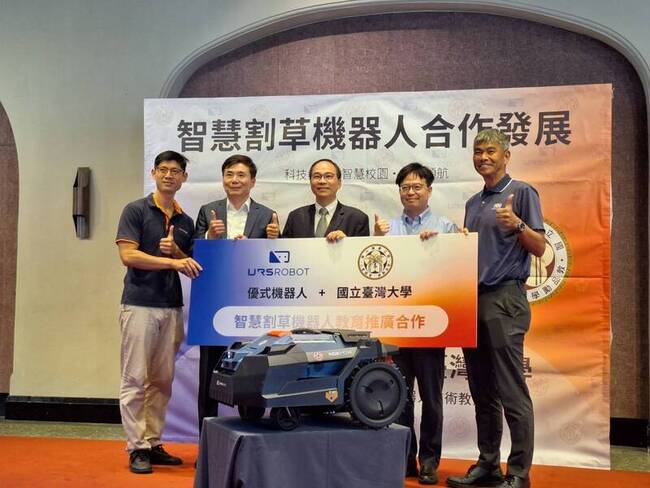 台灣大學體育室、台大機械工程系與優式機器人公司今天舉行記者會,將以「智慧割草機器人」為合作起點,共同打造具前瞻性的智慧校園與永續未來。