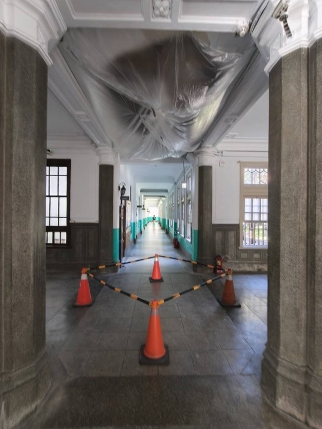 台師大學生會今天晚間透過社群平台向媒體說明,行政大樓天花板崩落,校方已清除所有掉落物,並為維護學生安全,已在現場架設三角錐。