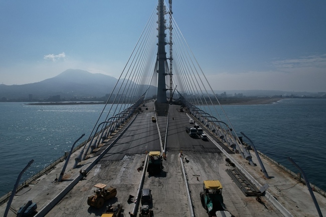 國內重要地標淡江大橋將在今年5月通車,去年9月16日合龍後工程持續推進,主橋瀝青鋪面已在昨天完成。交通部長陳世凱今天前往淡江大橋視察表示,瀝青鋪面完工是淡江大橋工程的一大里程碑,採三層設計,最底層為鋼板鋪面,接著導入4公分厚的GUSS瀝青混凝土,上層再鋪上改質瀝青。