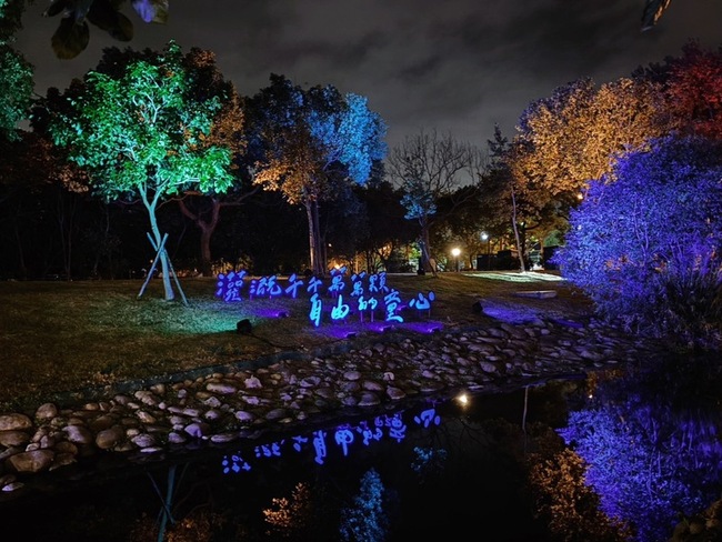 朱淑敏告訴中央社記者,日本籍藝術家小松宏誠在此次活動展出「雨之歌」、「風之花瓣」、「森之夢」等作品,將自然風景意象融入創作,並結合燈光色彩於光影藝術裝置中,盼展現與自然和諧共生的永續精神。