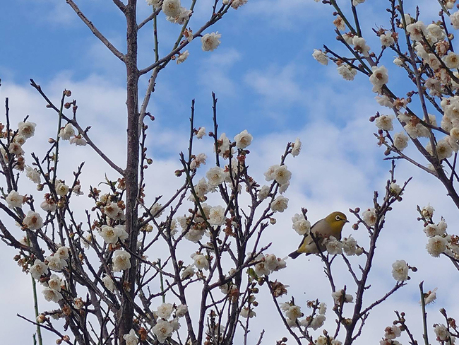 (中央社記者鄭維真彰化19日電)彰化縣芬園花卉生產休憩園區擁有1萬餘棵鴛鴦梅,目前梅花大爆發約開8成,適逢假日大批遊客前來拍照,偶有綠繡眼穿梭其間,既賞花又賞鳥,讓遊客驚喜不已。