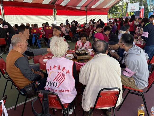 老五老基金會今天在石岡區社寮角萬興宮辦桌圍爐,邀請石岡、東勢、新社地區長者們參加新春圍爐,席開14桌,由志工團隊精心布置,高掛紅燈籠、播放老人家熟悉的民謠音樂,營造濃厚的年節氛圍。