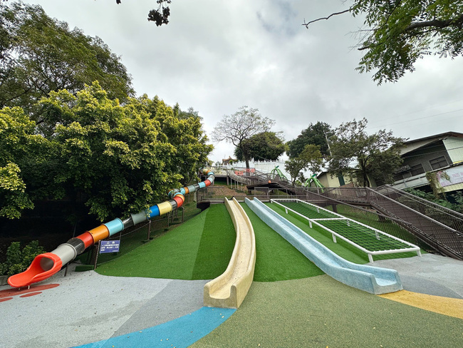 去年「喔熊遊憩區」啟用,搭建長約26公尺、約3層樓高管道式溜滑梯及2座長約11公尺磨石子溜滑梯,提供6到12歲孩童遊玩,卻常見未滿6歲幼童及家長使用,參山處再改善滑道寬度與彎曲程度,重新開放後使用年齡規範降低到2歲幼童也可玩。
