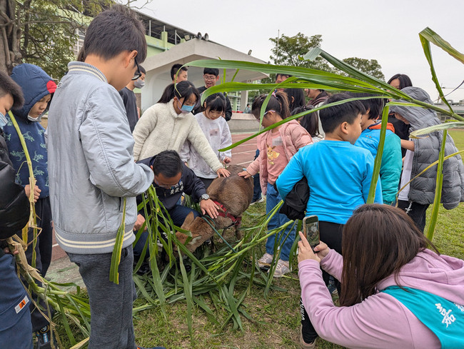 此外,也結合在地民雄育苗場教導學員種菜籽,體驗食農教育,重頭戲為皇佳鹿園執行長郭皇志,帶著鹿園的寵物梅花鹿到校園內操場與學童互動,掀起活動高潮,大人、小孩都很高興。