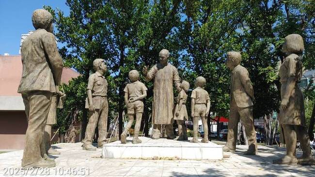 台南文化中心1984年開館後就已在戶外展示的「承先啟後」銅像群,涵蓋5名大人及4名小孩,其中有一座銅像貌似蔣中正,數年前曾出現遷移聲音,今天二二八紀念日議論再起。
