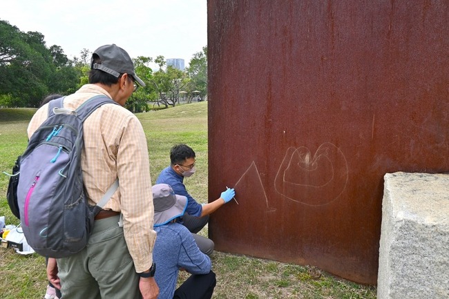 李孟懇在現場觀察破損痕跡後,先用刷子掃去表面粉塵,再用棉花棒少量多次沾純水細細清理,避免留下水漬。李孟懇說,這次修復只是基本清理,無法完全去除塗鴉痕跡。