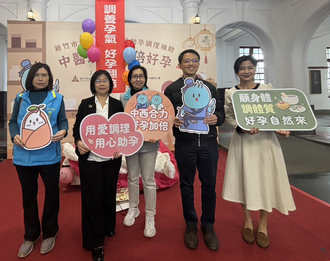新竹市政府今天舉辦「中醫助孕調理」補助說明記者會,代理市長邱臣遠、衛生局長陳厚全、新竹市中醫師公會理事長李如英、中醫師蔡宗璟等人出席。