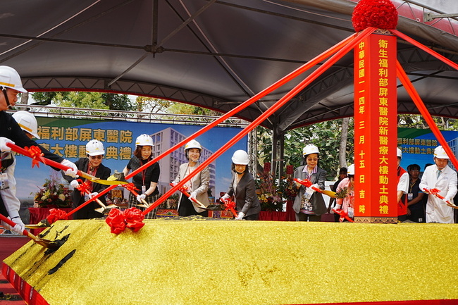 屏東醫院新醫療大樓在屏東縣政府協助下,獲行政院支持,工程款總金額約新台幣35.6億元,醫院自籌7億元,行政院公共建設計畫補助28.6億元,工程委託內政部國土署辦理。今天動土儀式,蕭副總統、內政部長劉世芳、衛福部次長林靜儀、總統府資政張博雅、屏東縣長周春米及屏東醫院院長王森稔等人出席。