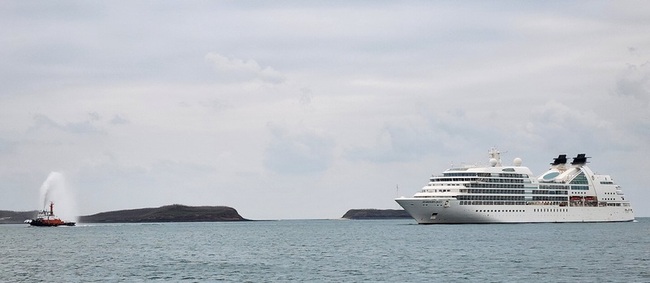 重達3萬2000噸級的「璽寶探險號」(SEABOURN QUEST)郵輪,滿載451名歐美旅客,16日自香港出發,今天清晨7時許抵達馬公港,港務公司出動拖船以噴水禮迎接,縣府在馬公碼頭區1號碼頭安排菊之音樂團表演等迎賓活動。