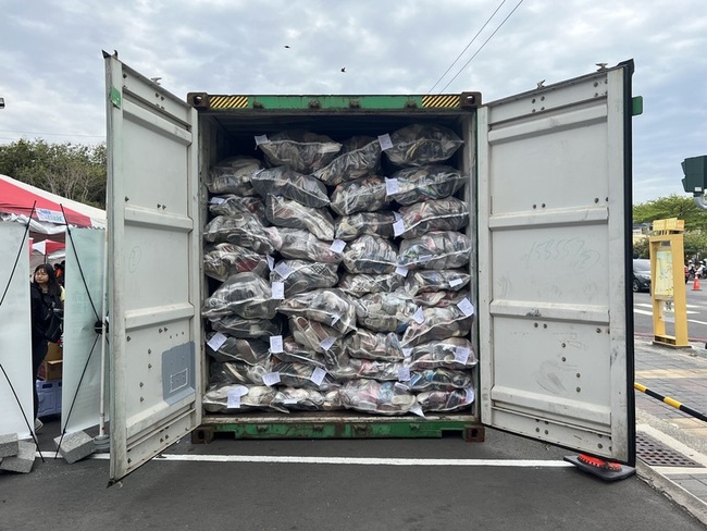 市府統計,逾1萬1000人響應「舊鞋救命」,3天募得2萬3800雙鞋、12萬5000多件衣物和9350個包包,總重超過45公噸,已塞滿1個貨櫃。