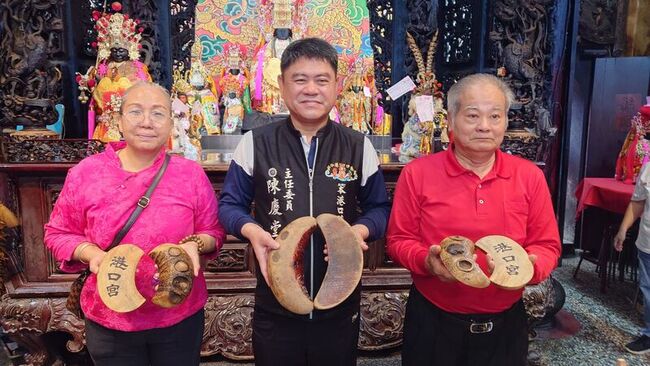 (中央社記者蔡智明嘉義縣10日電)嘉義縣政府認定的文化資產傳統工藝竹頭筊保存者黃奕薰,今天贈送嘉義東石鄉港口宮10對竹頭製筊杯,為媽祖祝壽,感念港口宮媽祖照顧,讓他手工竹頭筊得以聞名全台。