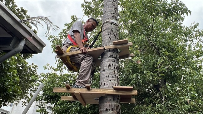 阿康說,過幾天他離開台東,7月後才會台東,目前先鋸2棵,其餘的13棵7月後再慢慢鋸,「這些椰子樹,高聳漂亮,要不是有危險,他也捨不得鋸」。