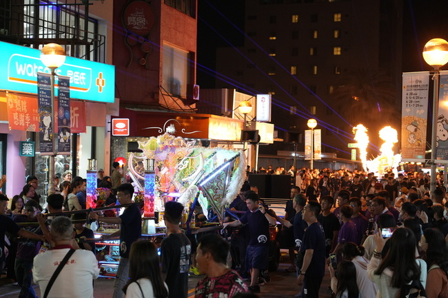 澎湖縣武轎總會「花火炫武遊西瀛武轎踩街」活動,今晚由澎湖縣長陳光復等人共同點燃起馬炮後登場,來自全縣17個宮廟的武轎,沿街遶境,結合噴射火焰、流行音樂與七彩燈光,打造出震撼人心的電子武轎,馬公市湧現人潮,非常熱鬧。