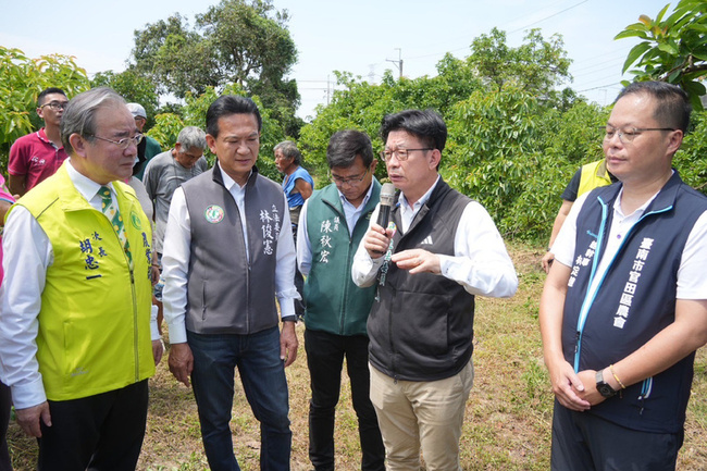 郭國文與林俊憲今天邀請農業部政務次長胡忠一、台南市政府農業局、官田及大內農會代表,以及在地果農,針對今年酪梨果樹受低溫多雨等氣候影響,著果率不佳影響產量進行實地會勘。