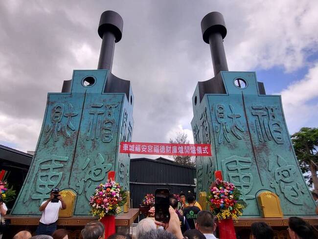(中央社記者黃郁菁屏東縣7日電)屏東車城福安宮香火鼎盛,因應燃燒金紙量與環保需求,新添福德財庫爐;福安宮表示,造型參考國家財政部、中央銀行等金融標誌,加入古錢幣元素設計,今天華麗亮相。