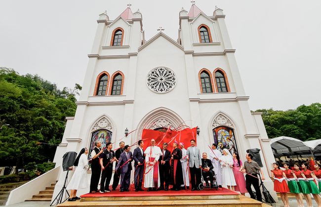 (中央社記者蔡智明嘉義縣10日電)天主教嘉義教區梅山教堂拉皮修繕完成,今天舉辦啟用典禮,上千名教友出席。教堂供奉全台唯一聖母穿清朝官服抱耶穌態像,建築類型為哥德式,又被譽為「台版巴黎聖母院」。