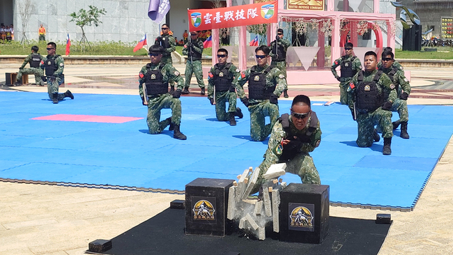 去年成立、由馬防部各島官兵組成的「雲台戰技隊」,此次展現平日訓練成果,配合震撼有力的音樂節奏,與行雲流水的動作,示範國軍所學的奪刀、奪槍、擒拿等基本戰技,並現場表演徒手劈磚、空手碎大石等困難動作,其中更有女性官兵參與,展現扎實訓練成果。