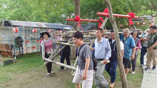 嘉義縣新港鄉長葉孟龍、雲林縣北港鎮長蕭美文、民進黨嘉義縣議員黃啟豪、林秀琴等人共襄盛舉,一同將竹橋底座抬至要搭建竹橋茅屋的蓮花池畔。